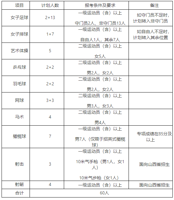 1、面向全国计划招收60人(含保送录取运动员),不列分省计划,其中射击、射箭项目仅面向山西省招生;