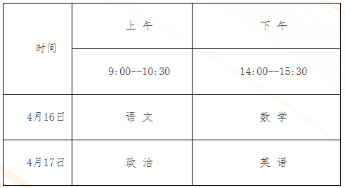 考生必须参加普通高考报名所在地省级招生考试机构组织的文化考试。文化考试科目为语文、数学、政治、英语四科,每科满分为150分,四科满分为600分,使用国家通用语言文字作答。具体考试时间如下:
